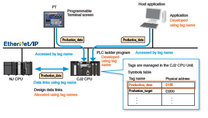 Using the multipurpose EtherNet/IP port built into a CJ/NJ/NX/NY CPU Unit, a single port can be used for data link communications between PLCs, messages between PLCs, and Universal Ethernet communications, such as FTP transfers while connecting Support Software. An EtherNet/IP Unit can be added to any CS/CJ-series PLC to achieve the same functions.