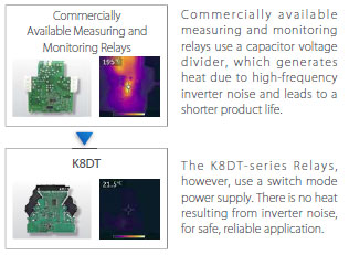 The operating frequency of Measuring and Monitoring Relays is low, which means the surfaces of relay contacts can deteriorate and reduces reliability. Particularly for microcomputer board and PLC inputs, a microcurrent of 5 mA or less for switching reliability is required, making transistor outputs superior.